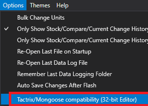 - Select options -> Tactrix/Mongoose compatibility (32-bit Editor)